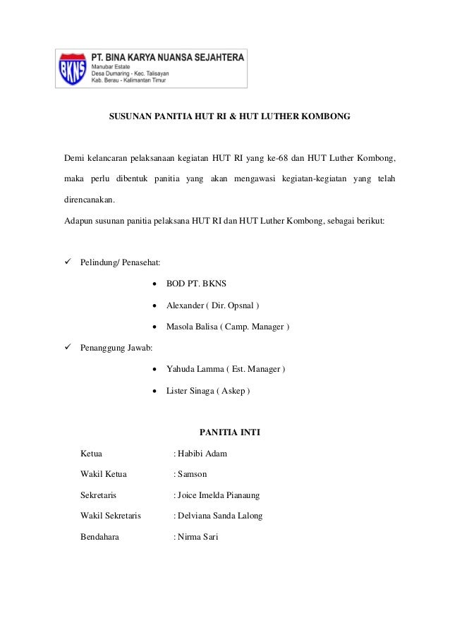 Contoh sk panitia hut ri ke 72 tahun 2017 info pendidikan terbaru Pelaksanan karnaval hut ri ke 72 pada hari sabtu tanggal 1 8 0ktober agustus 2017. Meriahkan hut ri ke 72 dan syuran agung pemerintah desa bentuk. Atas dasar kesepakatan ketua rt 006 ketua rt 005 dan para pemuda setempat pada tanggal 17 april 2015. Setiap tahun indonesia merayakan hut kemerdekaan yang dirayakan setiap tanggal 17 agustus. Untuk bisa lebih memahami lagi, berikut contoh proposal kegiatan sekolah yang mungkin bisa jadi referensi: Susunan panitia iuran hut ri ke 69. These are so many great picture list that may become your creativity and informational reason for contoh surat resmi hut ri design ideas for your own collections. Sasaran dalam peringatan hut ri ke 76 adalah seluruh warga sma budaya nusantara cikarang selatan termasuk di dalamnya seluruh tenaga pendidik dan staf serta karyawan yang bertugas. Proposal kegiatan peringatan hut kemerdekaan ri ke gambar.