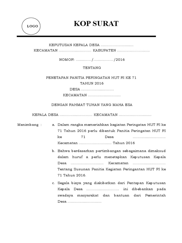 Contoh sk panitia hut ri ke 72 tahun 2017 sk hut ri 71. Bahwa untuk menjamin sukses dan lancarnya pelaksanaan peringatan hut ri ke 72 kemerdekaan republik indonesia tahun 2017 di kampung. Sk penetapan panitia hut ri adalah surat keputusan yang dikeluarkan oleh kepala desa sebagai dasar kerja dan tertib anggota panitia hut ri) (jangan ambil pusing, sobat tinggal download dan mengedit data sesuai yang sobat inginkan) Contoh sk penetapan panitia peringatan hut ri [9n0k7pw3zk4v]. Meriahkan hut ri ke 72 dan syuran agung pemerintah desa bentuk. Itulah struktur proposal kegiatan sekolah yang haru kamu ketahui untuk membuat sebuah kegiatan atau acara. Contoh surat keputusan bersama menteri contoh surat / sk panitia pembangunan dayah tgk. Keputusan kepala smpn 3 rambang dangku nomor : Sk panitia ujian sekolah sd 2016 zona sekolah.