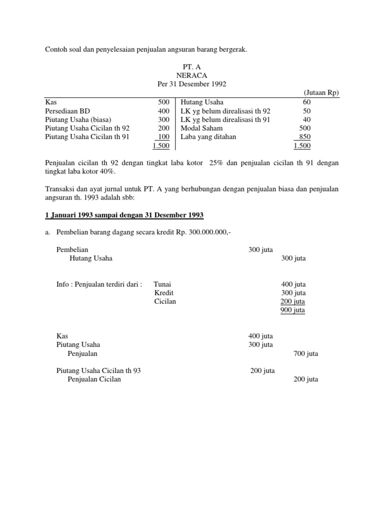 Pembatalan angsuran yang terjadi atas penjualan angsuran barang bergerak khususnya barang dagang yang terjadi pada firma kak raffi dengan. Contoh soal dan jawaban penjualan angsuran barang tidak bergerak seperti aktiva tetap akan dilaksanakan sesuai standar akuntansi keuangan nomor 23. Perlakukan akuntansi penjualan kredit dilaksanakan dengan mengakui laba rugi secara proporsional dan laba rugi secara langsung ketika terjadi pengiriman pesanan. 2% x 800.000 = 16rb angsuran v : Contoh soal penjualan angsuran aktiva tetap yang harus dikerjakan adalah menentukan tingkat bunga penjualan angsuran, membuat jurnal umum untuk mencatat transaksi penjualan angsuran dan buatlah tabel anuitas bunga menurun yang digunakan. Laba penjualan cicilan dapat diakui pada saat penjualan terjadi atau dilakukan perhitungan secara proporsional atas penerimaan tagihan yang terbayarkan. 2% x 1.600.000 = 32rb angsuran iii : 400.000,00 dengan bunga 18% pertahun. Tujuan penjualan angsuran adalah memudahkan pembeli memperoleh barang yang diinginkan walaupun tidak dapat membayar tunai.